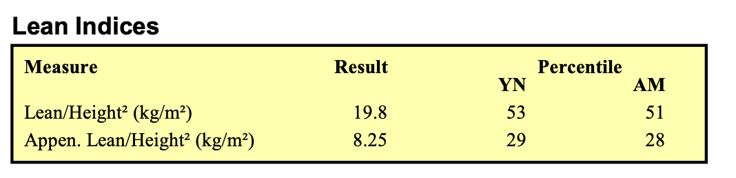 Lean indices are concerned with your lean tissue, primarily muscle. This is one of the most useful parts of the report for athletes and longevity enthusiasts, as lean mass is a strong predictor of muscle strength, metabolism, posture, and aging.