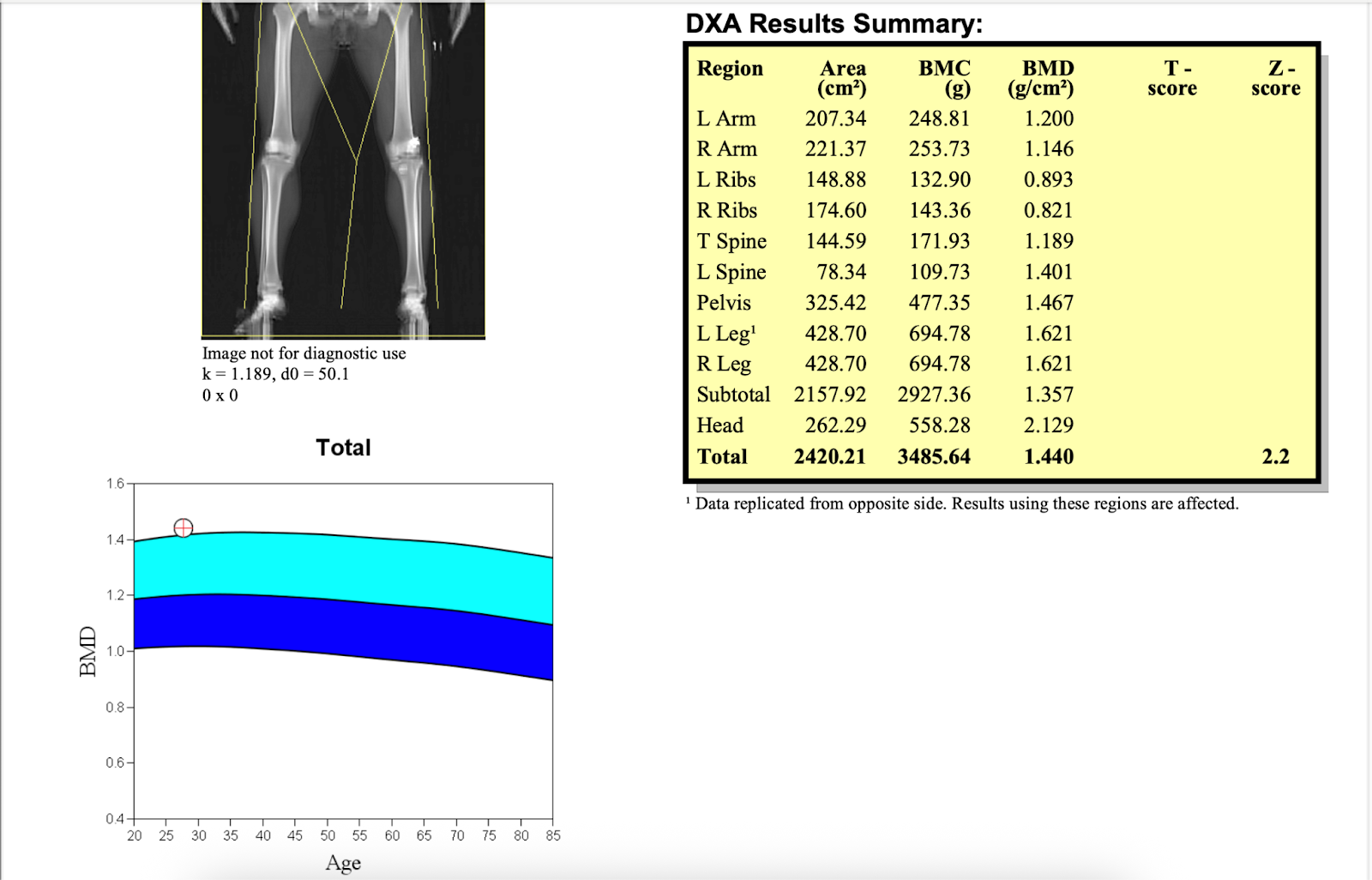 Whole-body scans may provide a general measure of BMD, but T and Z scoring is most reliable at specific sites such as the hip and spine. The T-score is blank here because this person is not over 50. If this person was over 50 he would have both a T-score and Z-score on his report.
